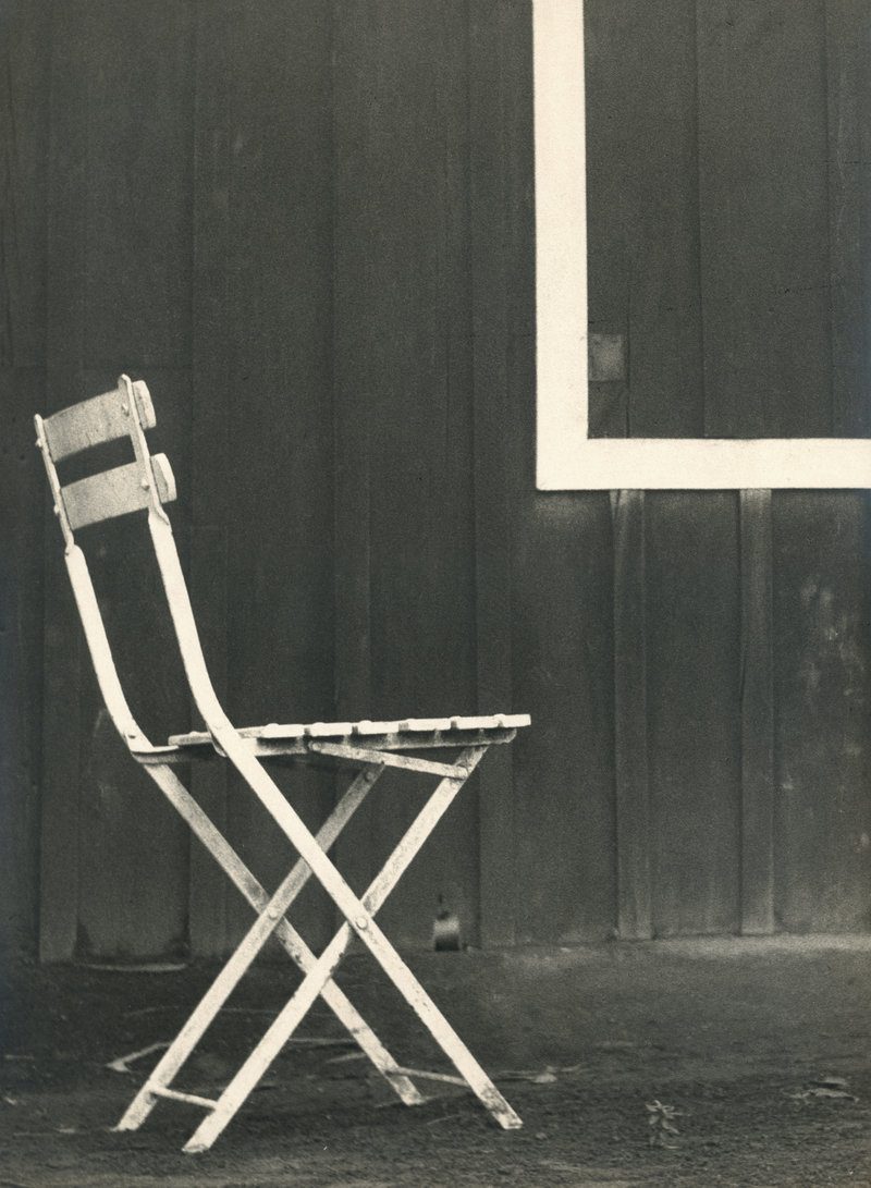 A Estudo (c. 1950), Palmira Puig fotografia una cadira plegable desplaçada del centre, retallada contra un fons fosc i vertical. La llum no acarona l’objecte: el talla. Les potes creuades formen una X precisa, gairebé constructivista. A la part superior, un angle recte interromp la superfície i imposa tensió. No hi ha narració. No hi ha context anecdòtic. Hi ha estructura.