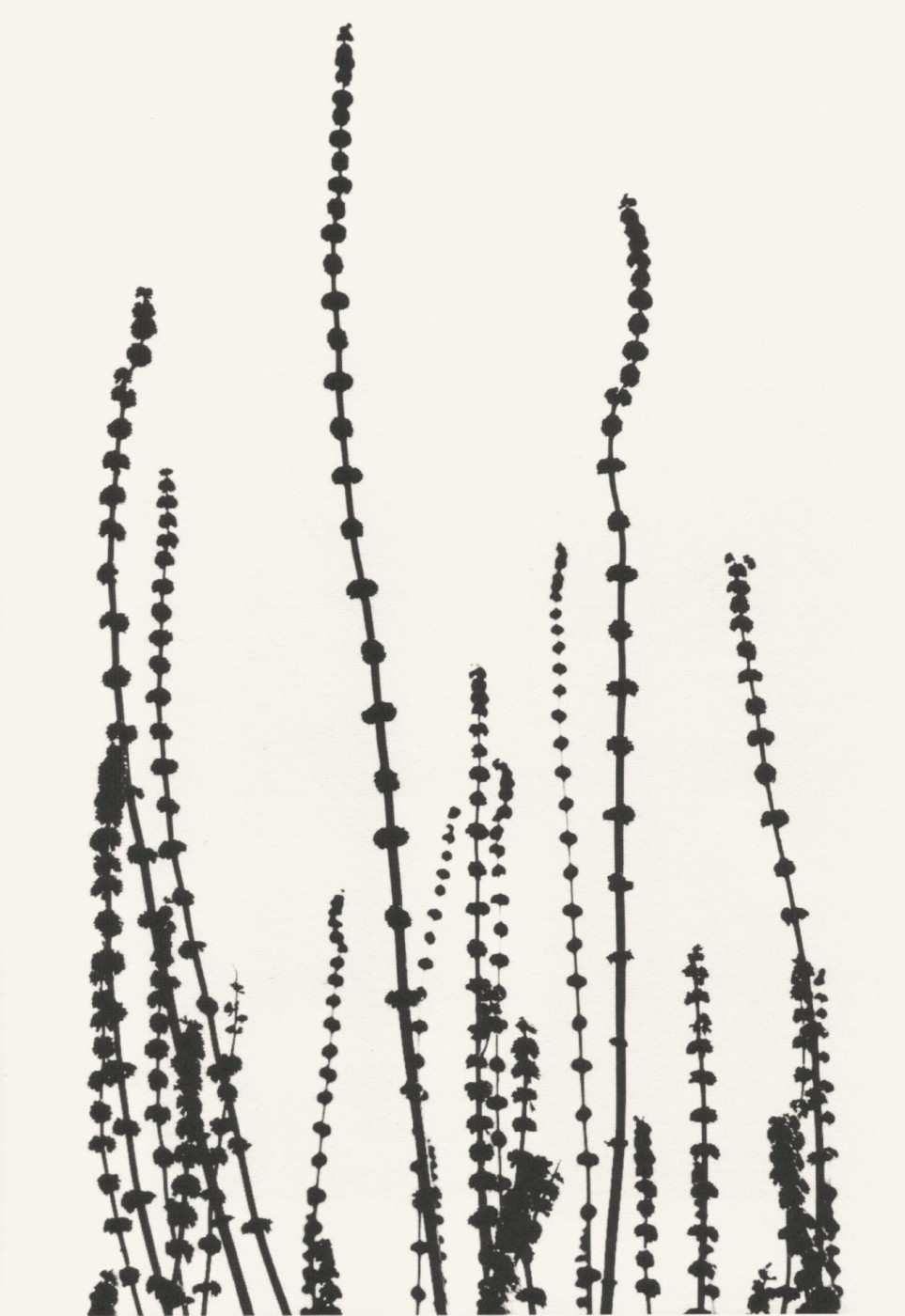 A Primavera (c. 1950), unes tiges fosques travessen el blanc del paper com si fossin una partitura. La fotografia es converteix en línia, en repetició, en interval. No hi ha descripció botànica. Hi ha ritme visual. Puig no documenta la natura: la reescriu.