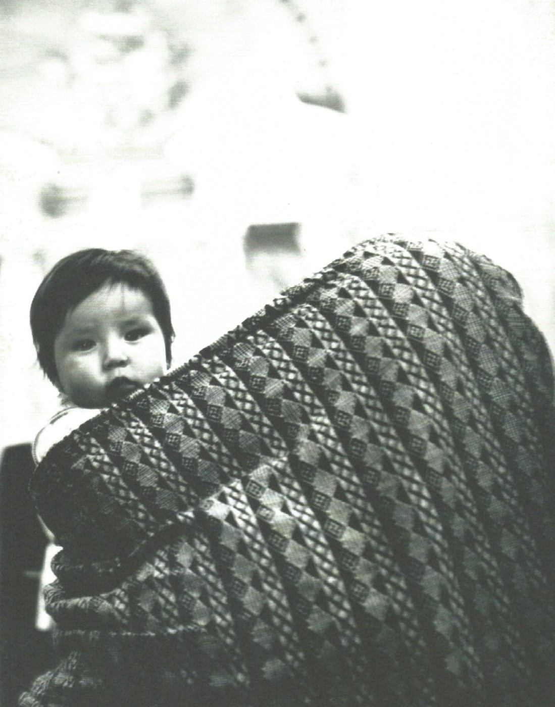 En una altra fotografia, una criatura embolcallada per un teixit de patrons geomètrics emergeix gairebé com una presència dins una massa ornamental. Protecció i confinament conviuen en el mateix enquadrament. Puig integra el cos dins l’estructura formal sense objectualitzar-lo.