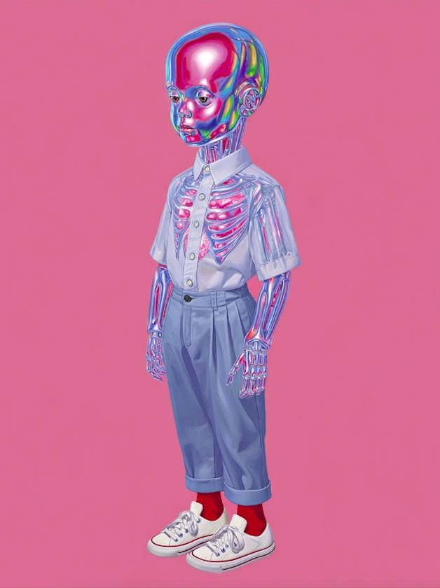 La peça va començar amb una pregunta: què passaria si combino la imatge quotidiana d’un infant amb la textura artificial del crom? Amb la IA, la pell es dissol en una superfície tornassolada i els ossos i músculs apareixen com radiografies acolorides, i crea així formes inimaginables de fer a mà.